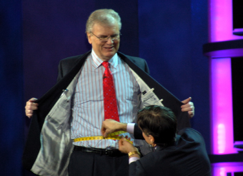 ウエストを測られるストリンガー氏。サイズは39インチとのこと