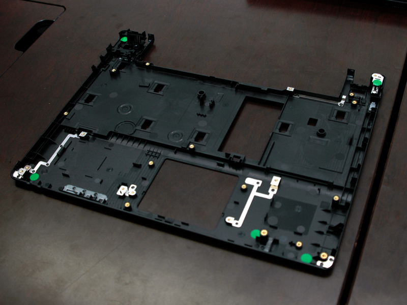 底面カバー。コーナー4箇所に使われているボス部品を大型のものにして堅牢性を高めた