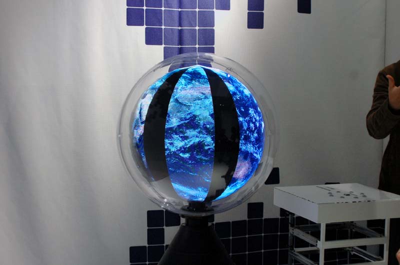 橋本典久氏による全天周ディスプレイ「Panorama Ball Vision」。320個のLEDをライン上に並べた6本の経線を搭載し、本体を回転させることで映像を見せる