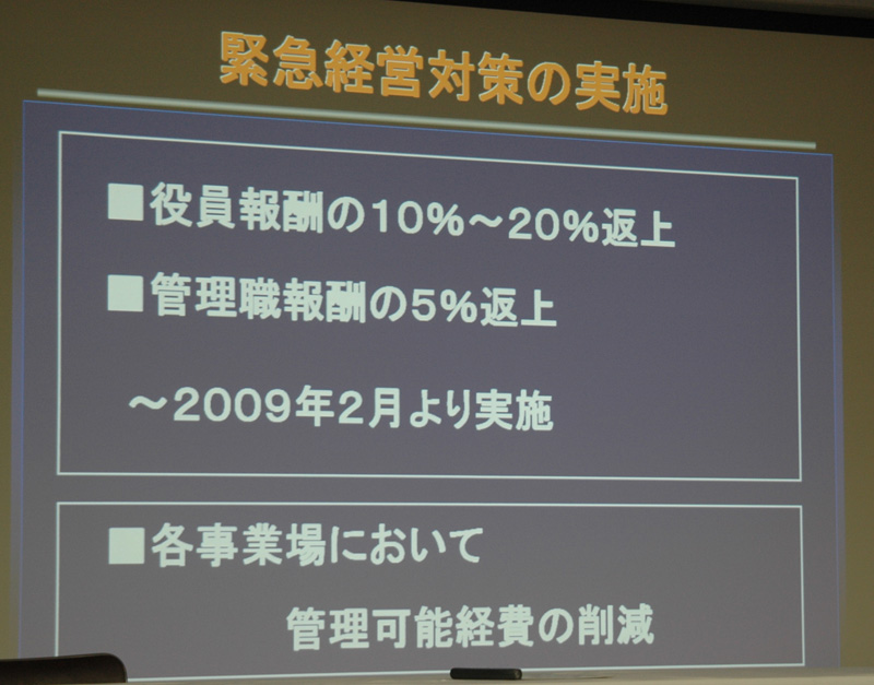 HOME > ニュース > AV&ホームシアターニュース 08年度の業績予想を下方修正 過去最大3,450億円規模の構造改革実施へ −パナソニックが3Q連結業績を発表 Phile-web編集部 2009年02月04日 前の写真へ 緊急経営対策を実施 前の写真へ この写真の記事へ 関連リンク パナソニックの決算報告概要