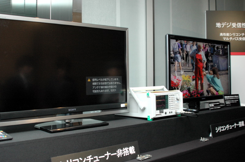 受信感度の高さをアピールするデモも実施。左の従来チューナーではブラックアウトする受信強度でも、右の新チューナー搭載機では問題なく映像を表示できている