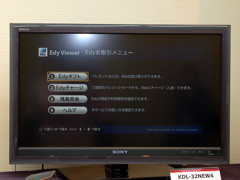 HOME > ニュース > AV&ホームシアターニュース FeliCa搭載、Edyでアクトビラ購入可能 【更新】ソニー、4倍速表示/アクトビラビデオ・フル対応の“BRAVIA”W5/F5シリーズを発売 Phile-web編集部 2009年03月02日 前の写真へ XMBからEdy Viewerを選んで、チャージなども行う事ができる 前の写真へ この写真の記事へ 関連リンク ソニー 直販サイト ソニースタイル