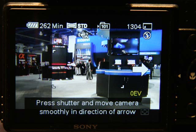 「Sweep panorama mode」で撮影するときのモニター画面。表示されている矢印の方向へカメラを動かし、ガイドに従ってその枠が埋まるまでパンニングすればOKだ