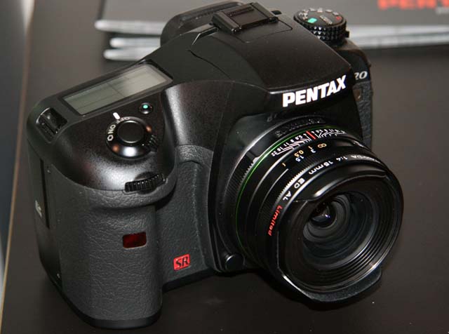 K20Dに装着した交換レンズ「DA 15mm F4 ED AL Limited」。周囲の出っ張り部分をそのまま引き出すとフードになる