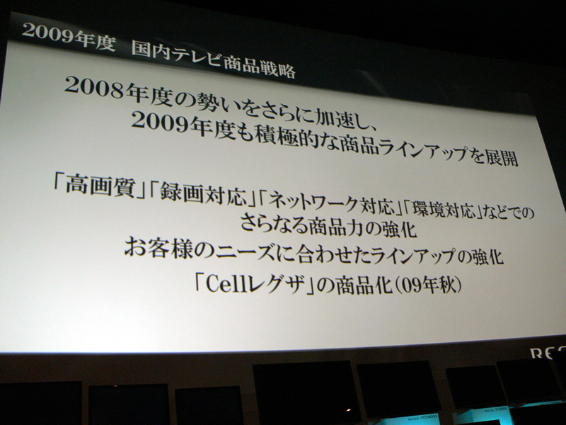 HOME > ニュース > AV&ホームシアターニュース Cell搭載REGZAについても言及 東芝、新“REGZA 8000シリーズ”の発表会を開催 - テレビ事業部長・大角氏が戦略を語る Phile-web編集部 2009年04月07日 前の写真へ 今秋にはCellレグザが投入されることを再確認した 前の写真へ この写真の記事へ 関連リンク 東芝REGZAのホームページ