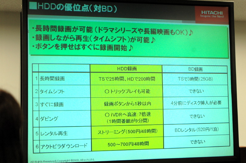HOME > ニュース > AV&ホームシアターニュース “Yes,Wooo Can!” 「できる録画テレビ」で視聴スタイルを変える − Wooo新モデルが目指すテレビ進化形 Phile-web編集部 2009年04月09日 前の写真へ 次の写真へ BDレコーダー内蔵テレビに対する内蔵HDD型の優位点 前の写真へ 次の写真へ この写真の記事へ 関連リンク HITACHI Wooo World Phile-web「Wooo WoRLD」