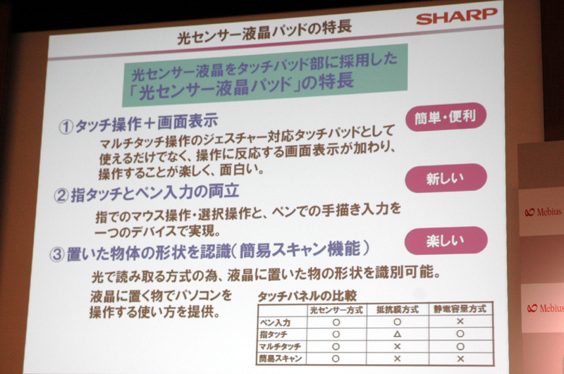 シャープ、光センサー液晶のタッチパッドを搭載した10.1型ノートPC“Mebius”を発売