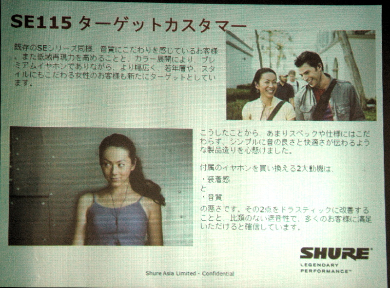 HOME > ニュース > AV&ホームシアターニュース 実売1万円前後のハイコストパフォーマンス機 SHUREのカナル型イヤホン「SE115」正式発表 − 4色カラバリ/新ダイナミック型ドライバー搭載 Phile-web編集部 2009年05月11日 前の写真へ SE115のターゲットカスタマー 前の写真へ この写真の記事へ 関連リンク Shureホームページ