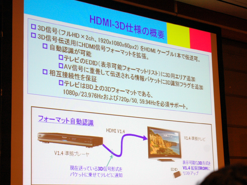 HOME > ニュース > AV&ホームシアターニュース 音声信号の相互送信対応、マイクロコネクタも登場 HDMI 1.4の詳細が明らかに − イーサネットを統合、3D/4K2Kもサポート Phile-web編集部 2009年05月28日 前の写真へ HDMI-3Dの仕様 前の写真へ この写真の記事へ 関連リンク 本件のニュースリリース HDMI Licensing,LLC