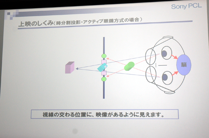 左右映像に同期してメガネの見える側も変わる。映像は脳内で合成され、立体視が得られる