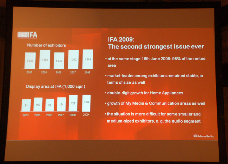 HOME > ニュース > AV&ホームシアターニュース 3Dやワイヤレスの革新技術を展示 開催直前「IFA2009」の注目トピックスが明らかに − メッセ・ベルリン ハイテッカー氏が会見 Phile-web編集部 2009年07月16日 前の写真へ 次の写真へ IFA2009でのさらなる成長を予測 前の写真へ 次の写真へ この写真の記事へ 関連リンク IFA2009日本語サイト IFA2009ホームページ(英語)