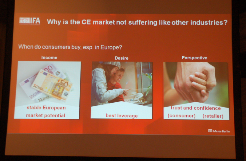 HOME > ニュース > AV&ホームシアターニュース 3Dやワイヤレスの革新技術を展示 開催直前「IFA2009」の注目トピックスが明らかに − メッセ・ベルリン ハイテッカー氏が会見 Phile-web編集部 2009年07月16日 前の写真へ 欧州のコンシューマー、トレーダーともに新製品への期待感が高く、人々の購買意欲も依然高まっているとアピールする 前の写真へ この写真の記事へ 関連リンク IFA2009日本語サイト IFA2009ホームページ(英語)