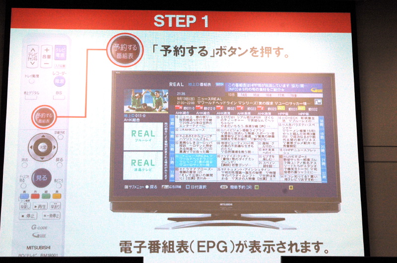 予約録画時の操作では、まずリモコンの「予約する」ボタンを押してEPGを表示する