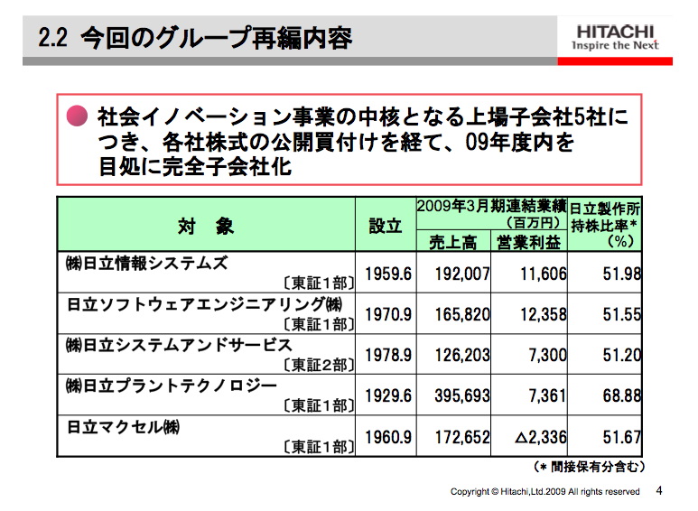 HOME > ニュース > AV&ホームシアターニュース 社会インフラ事業を強化 日立製作所、マクセルなど上場5社を完全子会社化 Phile-web編集部 2009年07月28日 次の写真へ 今回のグループ再編内容 次の写真へ この写真の記事へ 関連リンク (株)日立製作所 グループ再編に関するニュースリリース 第1四半期連結業績に関するニュースリリース