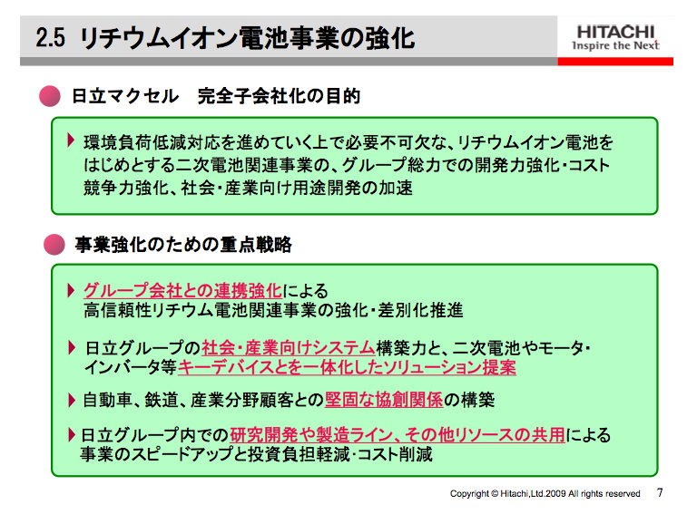 HOME > ニュース > AV&ホームシアターニュース 社会インフラ事業を強化 日立製作所、マクセルなど上場5社を完全子会社化 Phile-web編集部 2009年07月28日 前の写真へ 日立マクセルを子会社化してリチウムイオン電池など二次電池事業を強化 前の写真へ この写真の記事へ 関連リンク (株)日立製作所 グループ再編に関するニュースリリース 第1四半期連結業績に関するニュースリリース