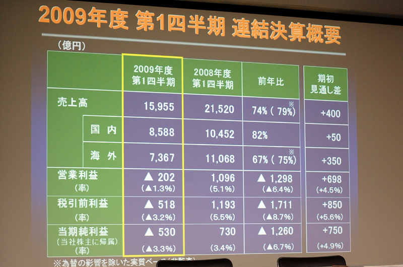 HOME > ニュース > AV&ホームシアターニュース 2Q連結累計業績見通しも上方修正 パナソニック、1Q連結決算を発表 - 全セグメントで減収も当初見込みより回復 Phile-web編集部 2009年08月03日 次の写真へ 2009年度 第1四半期の連結決算概要 次の写真へ この写真の記事へ 関連リンク パナソニックのIR情報