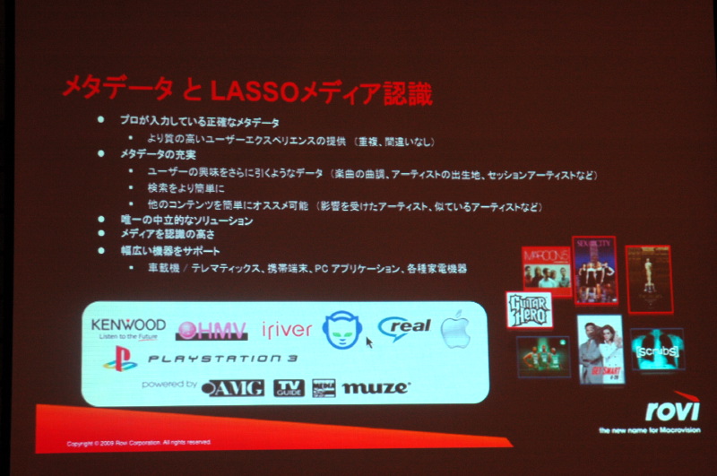 HOME > ニュース > AV&ホームシアターニュース 「日本をインキュベーターに」 ロヴィ、テレビ向けの統合UI「TotalGuide」をデモ − 新生マクロヴィジョンの戦略をアピール Phile-web編集部 2009年08月25日 前の写真へ 次の写真へ LASSOはアーティスト同士の関連性などのメタデータも備えている 前の写真へ 次の写真へ この写真の記事へ 関連リンク 米Rovi Corporation(英文) マクロヴィジョン(株)
