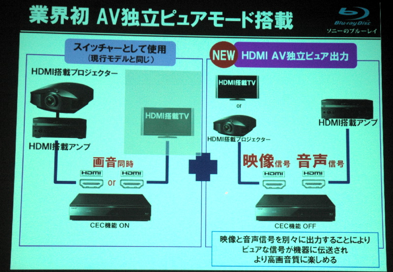 2つのHDMIの片側の端子から映像、もう片側の端子から音声を出力する「HDMI AV独立ピュア出力」モードも利用できるようになった