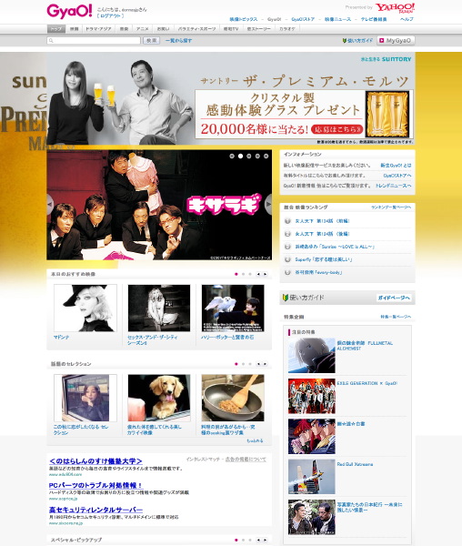 HOME > ニュース > AV&ホームシアターニュース Silverlightを採用 ヤフー、新生「GyaO!」を公開 − 無料/有料の2サイトで展開 Phile-web編集部 2009年09月07日 前の写真へ 無料サイトでは1社限定の広告も展開。本日はサントリーのプレミアムモルツがトップを独占している 前の写真へ この写真の記事へ 関連リンク GyaO! Presented by Yahoo! JAPAN GyaO! ストア Prensented by Yahoo! JAPAN