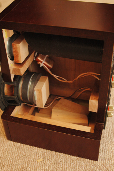 スピーカーのカットモデル。エンクロージャー内部にチェリー材の響棒を配置したほか、底部に竹材の響板を設け、解像感の向上、重心の低い低音、音場表現の拡大を実現している