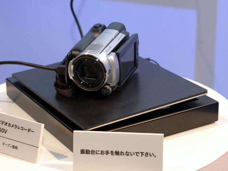 揺れ続ける台座に製品を乗せて手ブレ補正能力のデモを実施