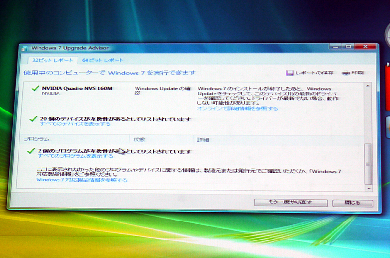 「windows 7 Upgrade Advisor」のデモ。このようにPCの問題点や解決法などを提示してくれる