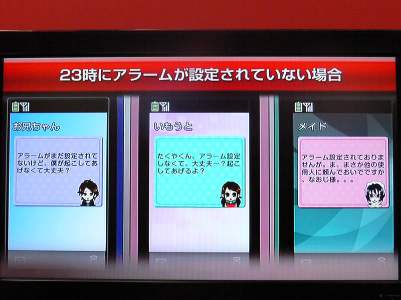 HOME > ニュース > AV&ホームシアターニュース CEATEC JAPAN 2009レポート ドコモ、新放送サービスや眼で動かすイヤホン/KDDIも新放送サービス/UQ WiMAXはモバイル端末など Phile-web編集部 2009年10月07日 前の写真へ 次の写真へ アラーム設定を忘れているときのアラート表示。三者三様の表現になっている 前の写真へ 次の写真へ この写真の記事へ 関連リンク CEATEC JAPAN 2009 CEATEC JAPAN 2009 レポート一覧 NTTドコモ KDDI UQコミュニケーションズ