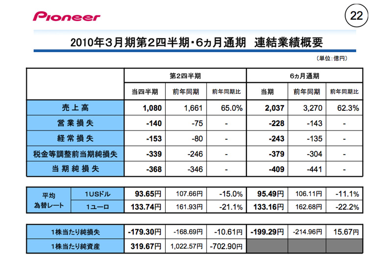 HOME > ニュース > AV&ホームシアターニュース 11月24日に川崎へ本社を移転・目黒本社は売却へ パイオニア、2009年度2Q連結業績を発表 − 赤字縮小し通期予想も上方修正 Phile-web編集部 2009年11月05日 次の写真へ 2009年度2Qの業績 次の写真へ この写真の記事へ 関連リンク パイオニアのIR情報