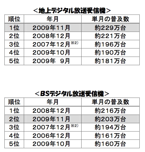 - JEITA、2011年2月の地デジ受信機国内出荷実績を発表 − 単月で258万台超を出荷 2011/03/23