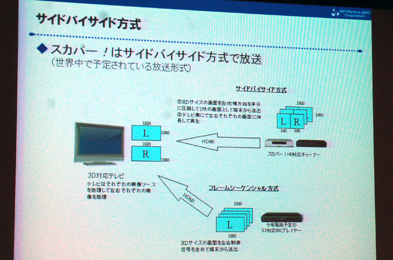 HOME > ニュース > AV&ホームシアターニュース 視聴方法や提供の詳細を発表 スカパー!が3D放送について会見 − 既存STBで視聴可能、サイド・バイ・サイド方式で配信 ファイル・ウェブ編集部 2010年01月27日 前の写真へ 3D方式には「サイド・バイ・サイド」方式を採用 前の写真へ この写真の記事へ 関連リンク スカパーJSAT(株)