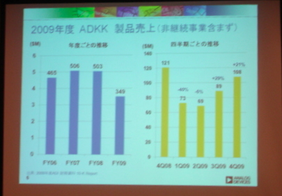 HOME > ニュース > AV&ホームシアターニュース 日本では外資系半導体メーカー売上高トップ5を目指す アナログ・デバイセズ、2010年度事業方針説明会を開催 AVレビュー編集部:西山 巨 2010年01月29日 前の写真へ 2009年第4四半期では利益額を大幅に回復した 前の写真へ この写真の記事へ 関連リンク アナログ・デバイセズ