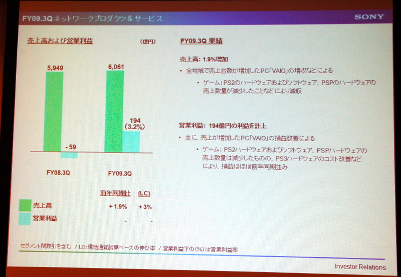 HOME > ニュース > AV&ホームシアターニュース 通期業績見通しも上方修正 ソニー、3Q決算は増収増益 − 来期はテレビ2,000万台目標、iPadの製品領域にも参入意欲 ファイル・ウェブ編集部 2010年02月04日 前の写真へ 「ネットワークプロダクツ&サービス」(NPS)分野の業績概要 前の写真へ この写真の記事へ 関連リンク ソニー ソニースタイルの製品情報