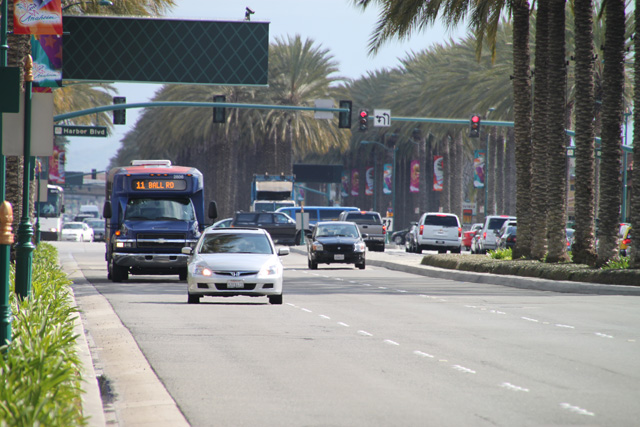 会場前の道路は椰子の木が生い茂り、走り去るクルマもどこかのんびりとした雰囲気が漂う