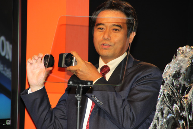 HOME > ニュース > AV&ホームシアターニュース 一眼レフと小型モデルの2ライン 【PMA2010】ソニーがついに動画対応一眼カメラを発表 − 年内に数機種を発売予定 会田肇 2010年02月22日 次の写真へ ソニーの動画対応一眼カメラのモックアップを手にコンセプトを解説するソニー(株)パーソナルイメージング&サウンド(PI&S)事業本部 今村事業本部長 次の写真へ この写真の記事へ 関連リンク PMA2010 公式サイト