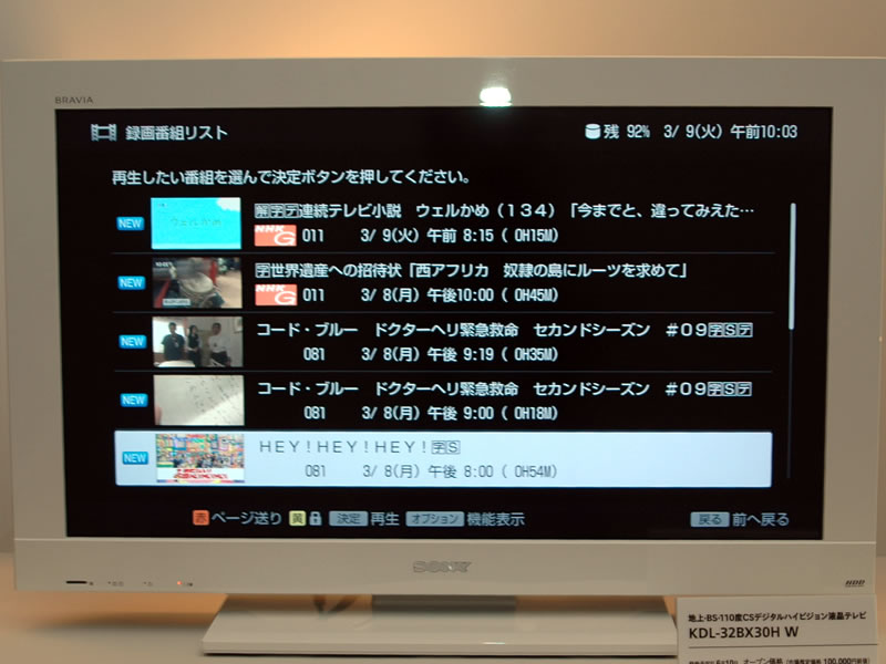 HOME > ニュース > AV&ホームシアターニュース 録る・見る・消すの動作がシンプルにできるエントリー機 ソニー、同社初の録画対応液晶テレビ「BX30H」シリーズを発売 − 内蔵HDDは500GB ファイル・ウェブ編集部 2010年03月09日 前の写真へ 録画コンテンツの一覧画面 前の写真へ この写真の記事へ 関連リンク ソニー ソニースタイルの製品情報