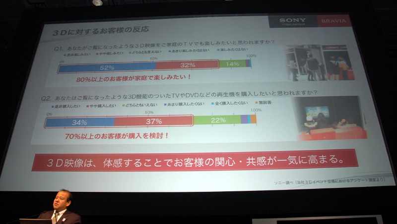HOME > ニュース > AV&ホームシアターニュース 「進化するテレビ」についても言及 「3DテレビシェアNo.1を目指す」 − ソニー“BRAVIA”発表会詳報 ファイル・ウェブ編集部 2010年03月09日 前の写真へ 3D体験イベントの体験者のアンケート結果 前の写真へ この写真の記事へ 関連リンク ソニー ソニースタイルの製品情報