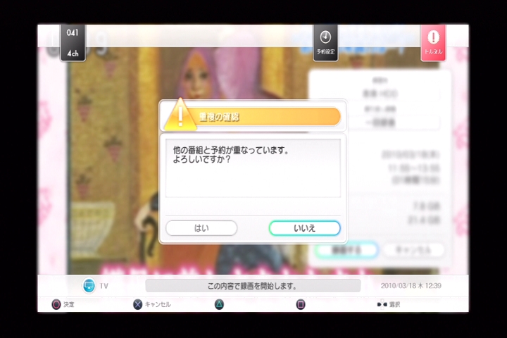HOME > ニュース > AV&ホームシアターニュース 使い勝手の善し悪しが見えてきた 「torne」の“録画機能”をじっくり使い込んだ − ケースイが導入速報をお届け【録画・ネットワーク編】 レビュー:鈴木桂水 2010年03月19日 前の写真へ 次の写真へ すると予約に関しての警告画面が出る。ここで予約を決定した 前の写真へ 次の写真へ この写真の記事へ 関連リンク 「torne」公式サイト ソニー・コンピュータエンタテインメント