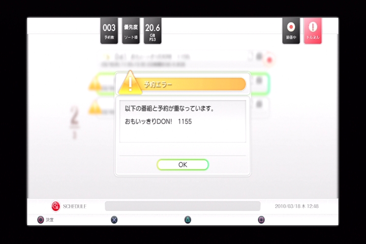 HOME > ニュース > AV&ホームシアターニュース 使い勝手の善し悪しが見えてきた 「torne」の“録画機能”をじっくり使い込んだ − ケースイが導入速報をお届け【録画・ネットワーク編】 レビュー:鈴木桂水 2010年03月19日 前の写真へ 次の写真へ 予約リストを見ると、録画中の番組と予約が重なっている注意書きが表示される。この画面で予約取り消しができればいいのだが、残念ながら一度この画面を抜けて、番組表から予約削除をしなければならない 前の写真へ 次の写真へ この写真の記事へ 関連リンク 「torne」公式サイト ソニー・コンピュータエンタテインメント