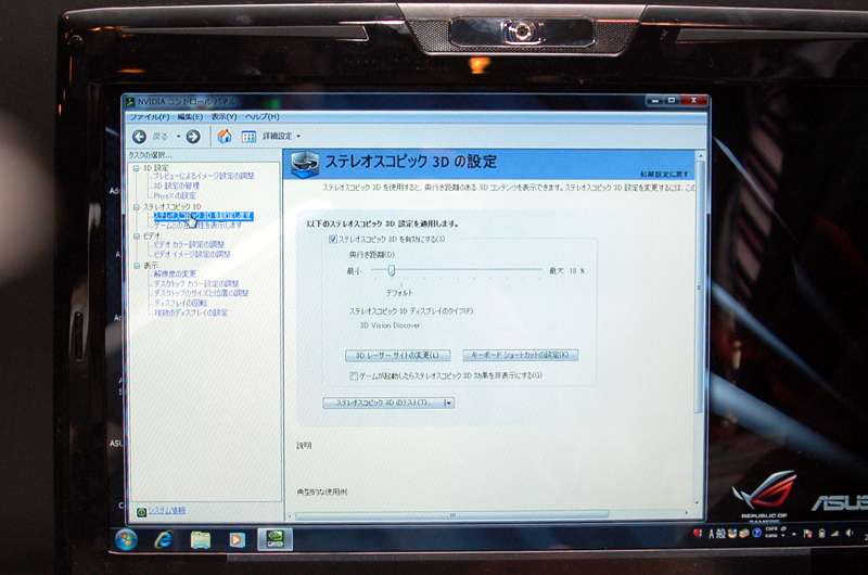 HOME > ニュース > AV&ホームシアターニュース アクティブシャッター方式を採用/メガネ1個が標準付属 ASUSから3D視聴可能な15.6型ノートパソコン「G51Jx 3D」が登場 − 高い画・音スペックを搭載 ファイル・ウェブ編集部 2010年04月14日 前の写真へ 次の写真へ NVIDIAコントロールパネルで「ステレオスコピック3Dを有効にする」にチェックを入れると3D視聴ができる 前の写真へ 次の写真へ この写真の記事へ 関連リンク ASUSのニュースリリース NVIDIA Japan