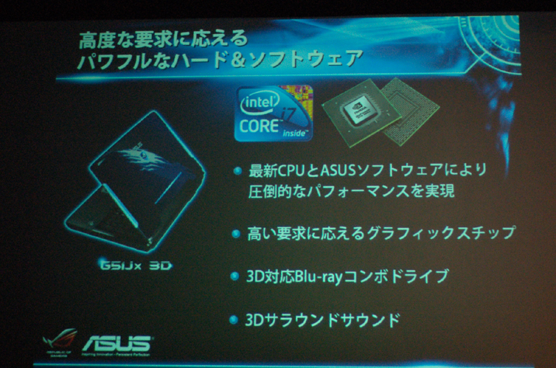 HOME > ニュース > AV&ホームシアターニュース アクティブシャッター方式を採用/メガネ1個が標準付属 ASUSから3D視聴可能な15.6型ノートパソコン「G51Jx 3D」が登場 − 高い画・音スペックを搭載 ファイル・ウェブ編集部 2010年04月14日 前の写真へ 次の写真へ NVIDIAのグラフィックボードやサウンドボードを採用している 前の写真へ 次の写真へ この写真の記事へ 関連リンク ASUSのニュースリリース NVIDIA Japan