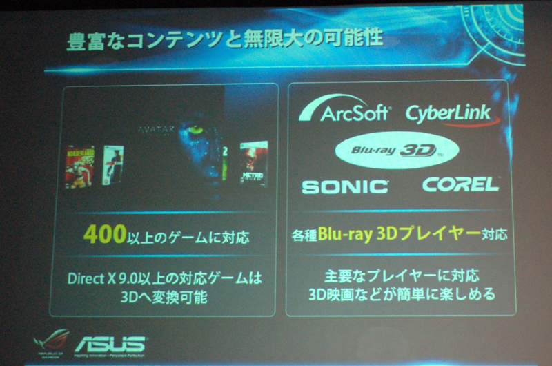 HOME > ニュース > AV&ホームシアターニュース アクティブシャッター方式を採用/メガネ1個が標準付属 ASUSから3D視聴可能な15.6型ノートパソコン「G51Jx 3D」が登場 − 高い画・音スペックを搭載 ファイル・ウェブ編集部 2010年04月14日 前の写真へ 次の写真へ 400以上のゲームを楽しめるほか、Blu-ray 3Dの視聴も可能 前の写真へ 次の写真へ この写真の記事へ 関連リンク ASUSのニュースリリース NVIDIA Japan
