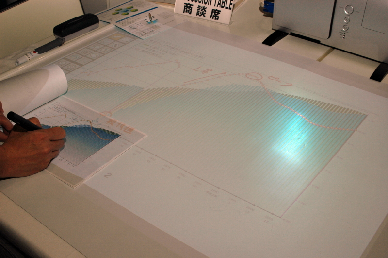 専用紙に印刷したプレゼン資料にデジタルペンで書き込んだ内容がホワイトボードと液晶ディスプレイに反映される