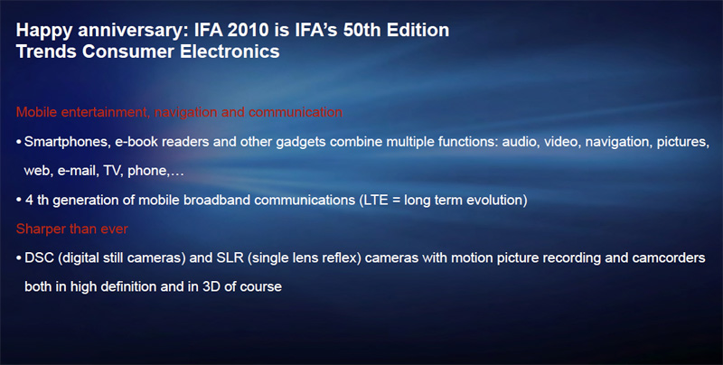 HOME > ニュース > AV&ホームシアターニュース “開催50回記念”のIFAは9月3日にベルリンで開幕 IFA2010の出展コンセプトが明らかに − アップル関連機器など集めた「IFA iZone」や「eBook」エリアを新設 ファイル・ウェブ編集部 2010年04月26日 前の写真へ 次の写真へ モバイル製品のトレンド予測 前の写真へ 次の写真へ この写真の記事へ 関連リンク IFA2010日本語サイト IFA2010グローバルサイト