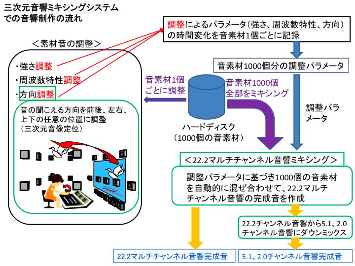 HOME > ニュース > AV&ホームシアターニュース NHK技研公開でも展示 NHK、スーパーーハイビジョンの22.2ch音響を少数SPで再現する方式やミキシングシステムを開発 ファイル・ウェブ編集部 2010年05月20日 前の写真へ ミキシングシステムでの音響制作の流れ 前の写真へ この写真の記事へ 関連リンク NHK技研公開2010