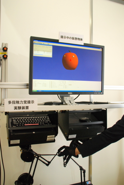 複数の力覚提示デバイスを制御することで物体を実際に触っている感覚を体感できる。堅さなども感じ取れる