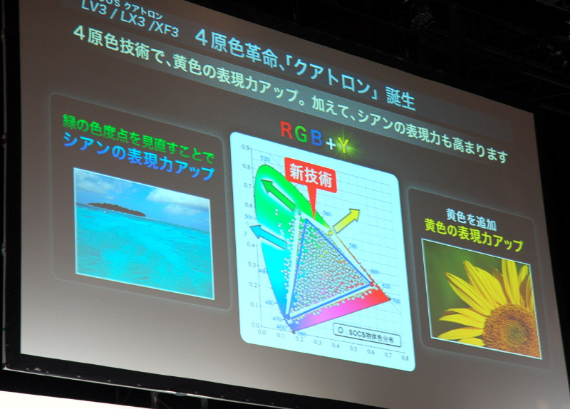 HOME > ニュース > AV&ホームシアターニュース 従来比約1.8倍の明るい3D映像を実現 【更新】シャープ、初の3Dテレビなど4原色パネル搭載「AQUOS クアトロン」を発売 ファイル・ウェブ編集部 2010年05月31日 前の写真へ 次の写真へ 4原色にすることでイエロー、シアンの色再現範囲が大幅に拡大 前の写真へ 次の写真へ この写真の記事へ 関連リンク シャープ AQUOS商品サイト シャープ クアトロンスペシャルサイト シャープ 3D技術解説サイト