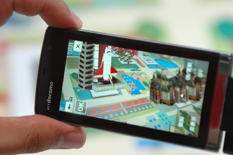 案内板を携帯電話を通してのぞくと建物が立体的にみえる。お店の情報なども表示できる
