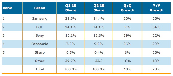 HOME > ニュース > AV&ホームシアターニュース 上位メーカーは軒並み堅調 ディスプレイサーチ、第2四半期の世界テレビシェアを発表 − ソニーとパナソニックがシェア伸ばす ファイル・ウェブ編集部 2010年09月01日 2010年のグローバル ブランド別シェア この写真の記事へ 関連リンク 本件の詳細(英文) ディスプレイサーチ(英文)