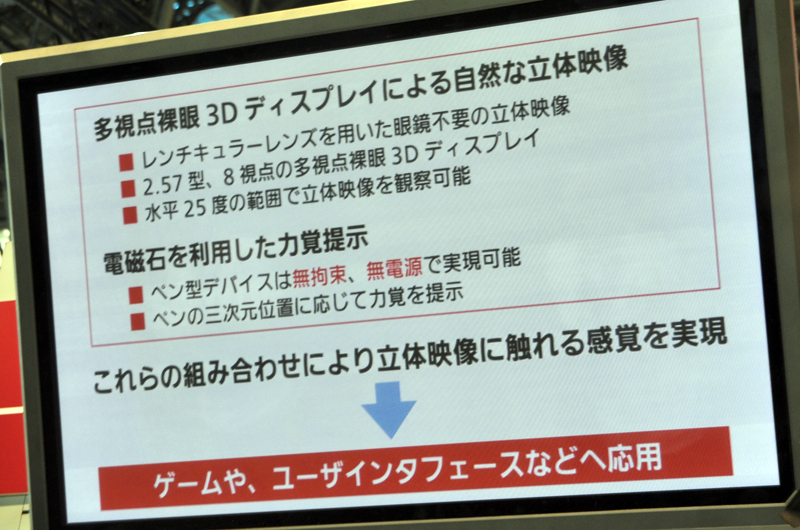 HOME > ニュース > AV&ホームシアターニュース 充電台に置くだけの「ワイヤレス充電」技術も 【CEATEC】ドコモ、“触れる”3Dディスプレイや2Dディスプレイで3D写真を楽しめる技術などを展示 ファイル・ウェブ編集部 2010年10月06日 前の写真へ 次の写真へ 今後はゲームやユーザーインターフェースなどに応用を考えているとのことだ 前の写真へ 次の写真へ この写真の記事へ 関連リンク CEATEC 関連記事一覧 CEATEC公式サイト