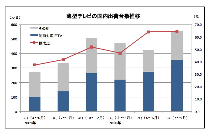 HOME > ニュース > AV&ホームシアターニュース 3Dパソコンは0.52% 3D対応テレビの4〜9月構成比は1.34%、JEITA発表 ファイル・ウェブ編集部 2010年10月27日 薄型テレビの出荷台数と動画対応IPTV対応モデルの推移 この写真の記事へ 関連リンク 本件のニュースリリース(PDF) JEITA